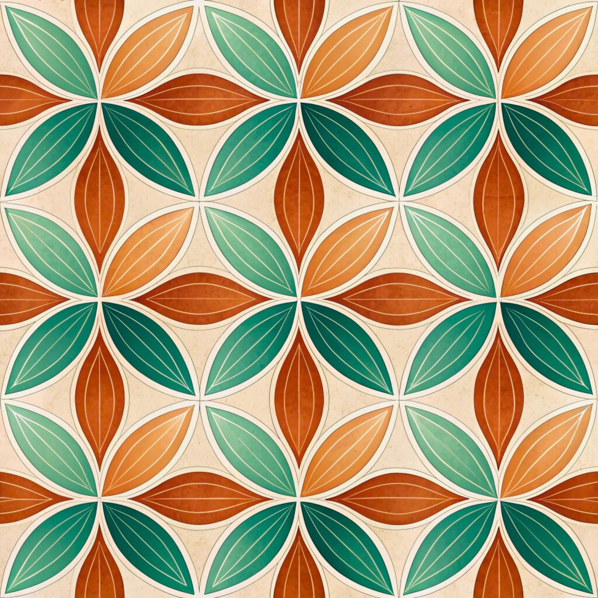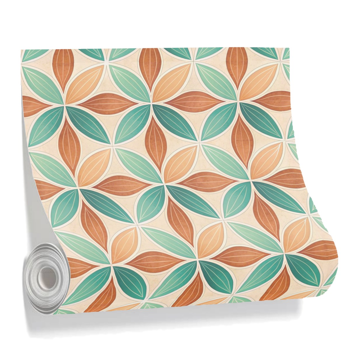 A retro geometric pattern featuring stylized flowers with alternating teal and terracotta-orange petals. The seamless design is set on a cream, textured background, creating the look of vintage ceramic tiles with a mid-century modern aesthetic.