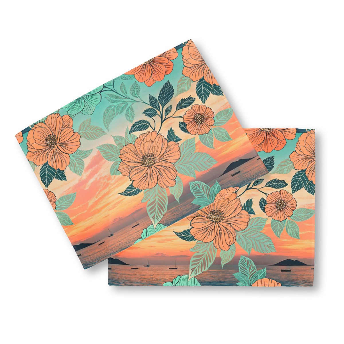 This composite image blends a stylized floral pattern with a realistic ocean sunset. Bold orange and turquoise flowers are overlaid on a serene seascape featuring sailboats and distant islands under a vibrant, cloudy sky, creating a unique artistic collage.