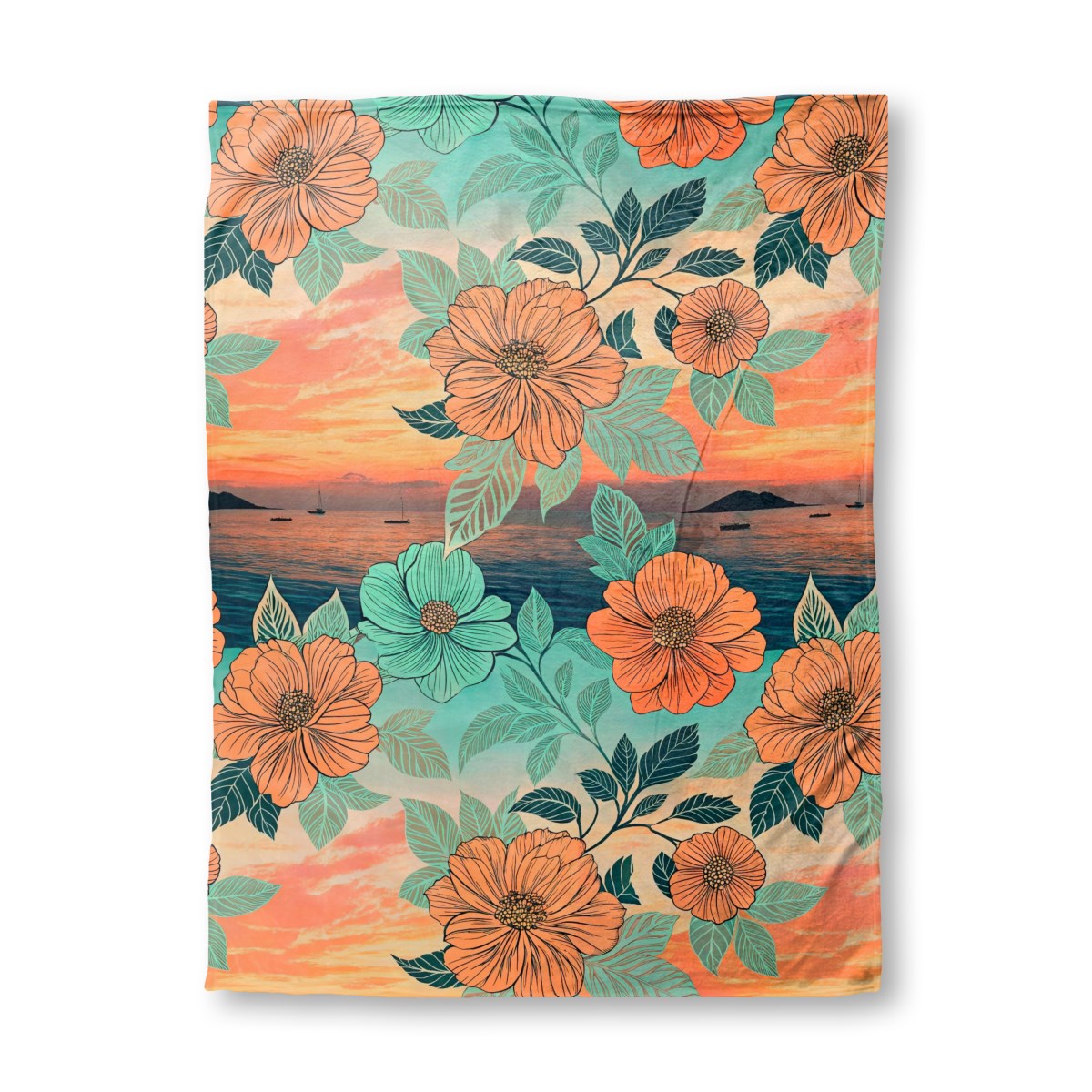 This composite image blends a stylized floral pattern with a realistic ocean sunset. Bold orange and turquoise flowers are overlaid on a serene seascape featuring sailboats and distant islands under a vibrant, cloudy sky, creating a unique artistic collage.