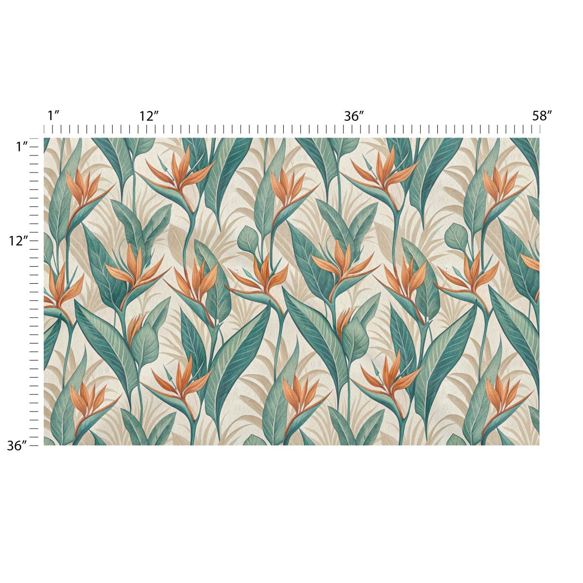A stylized, seamless pattern of tropical flora. Vibrant orange Bird of Paradise flowers and large, teal-green leaves are illustrated against a light, textured background with muted beige foliage, creating a lush, vintage-inspired design.
