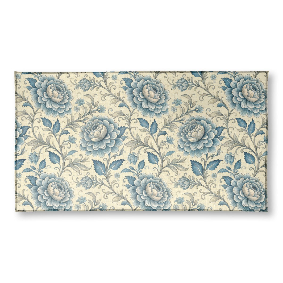 An elegant, traditional floral pattern featuring large, detailed blue and cream peonies. The flowers are interwoven with scrolling grey and blue vines on a dotted, pale yellow background, creating a sophisticated, vintage-inspired design suitable for textiles or wallpaper.