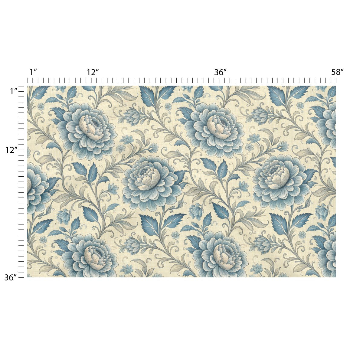 An elegant, traditional floral pattern featuring large, detailed blue and cream peonies. The flowers are interwoven with scrolling grey and blue vines on a dotted, pale yellow background, creating a sophisticated, vintage-inspired design suitable for textiles or wallpaper.
