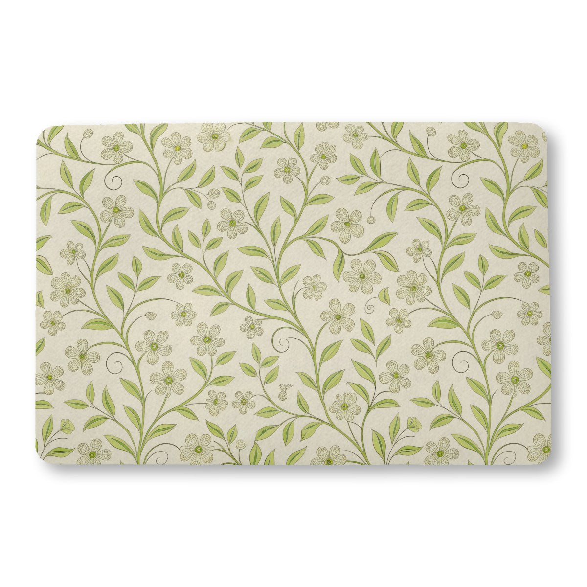 A delicate, vintage-style floral pattern featuring gracefully curving green vines and leaves on a cream background. The small white flowers have a distinctive, web-like texture on their petals, creating a charming and elegant design suitable for wallpaper or fabric.