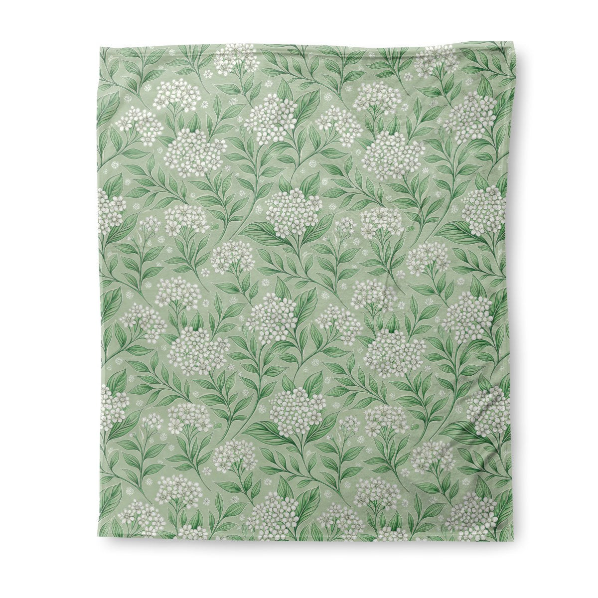 This is a seamless botanical pattern featuring elegant clusters of small white flowers and detailed green leaves. The graceful, curving stems are set against a soft sage green background, creating a classic, vintage-inspired design.