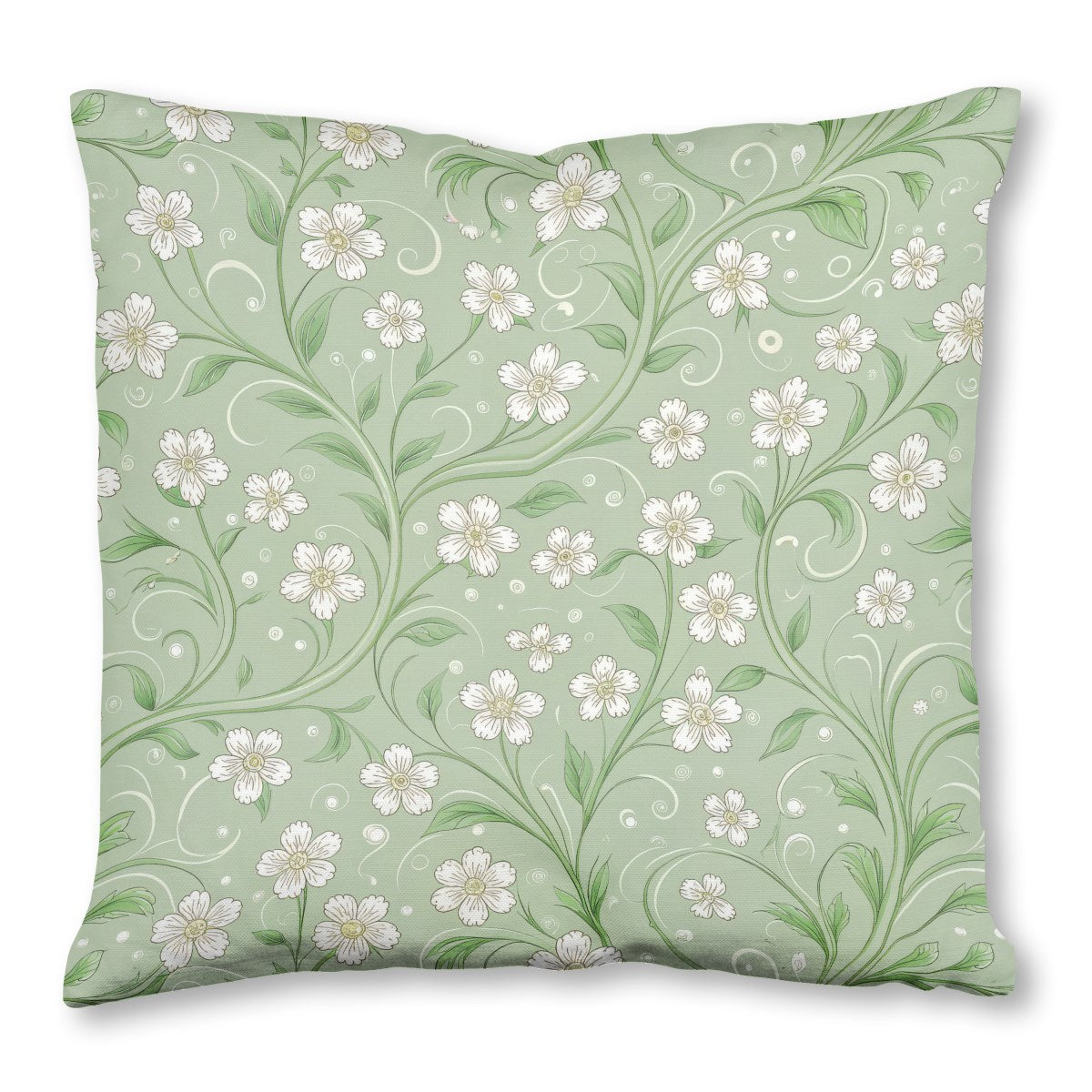 A vintage-style seamless pattern featuring delicate white flowers on gracefully swirling green vines. The intricate, elegant design is set against a soft, muted sage green background with subtle decorative swirls, creating a classic and serene composition.