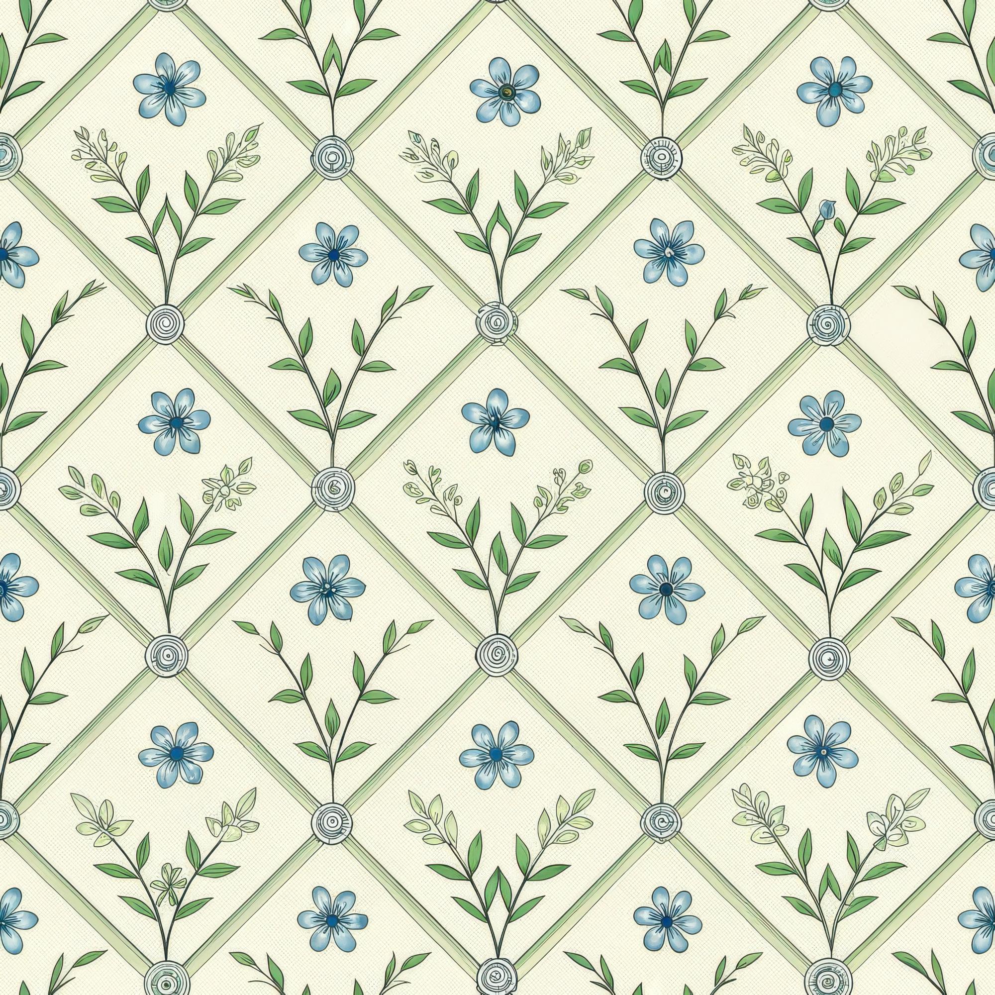 A seamless botanical pattern featuring a light green diagonal trellis on a cream background. The diamond shapes contain alternating motifs of a single blue flower and a leafy green sprig, creating a delicate, vintage-inspired design suitable for wallpaper or fabric.