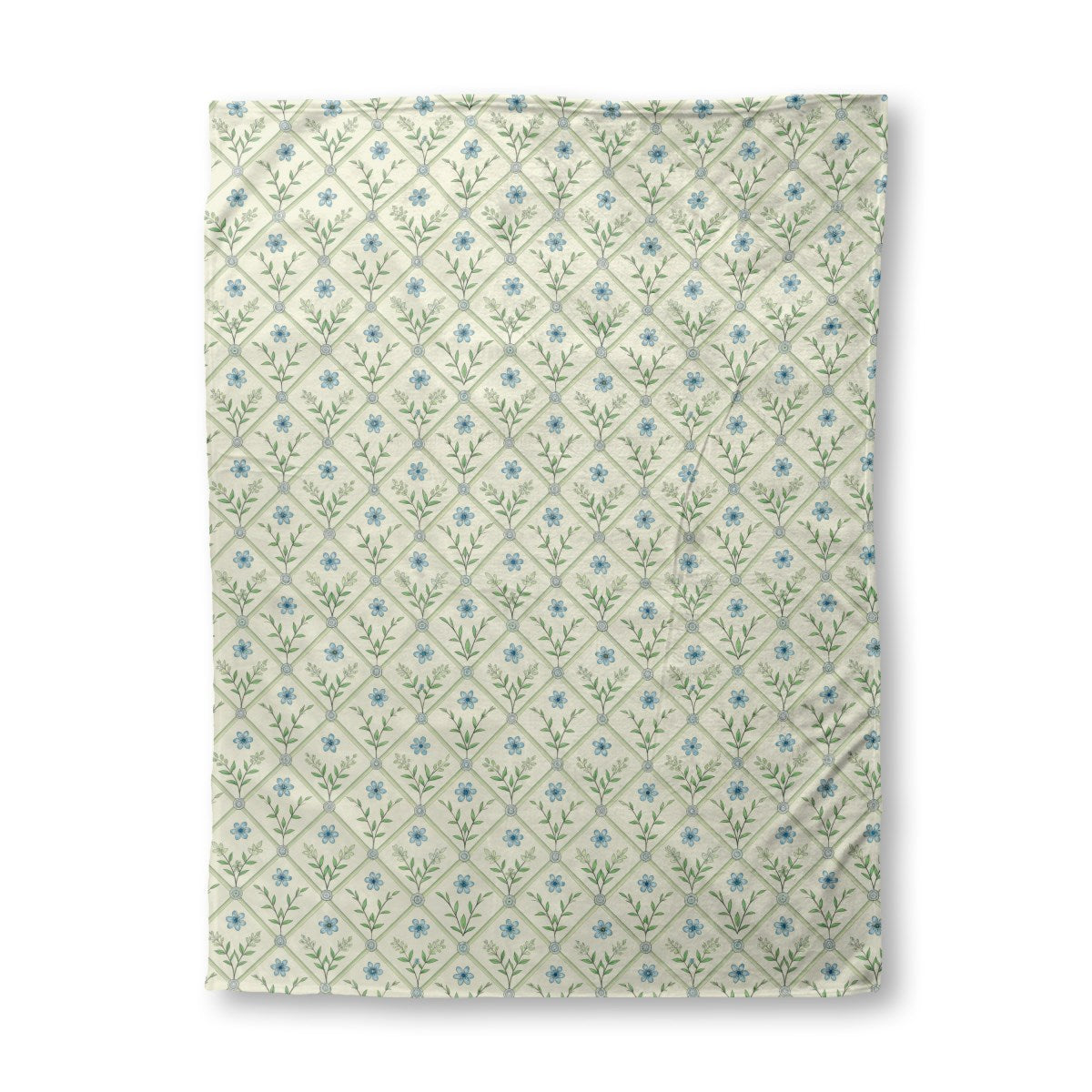 A seamless botanical pattern featuring a light green diagonal trellis on a cream background. The diamond shapes contain alternating motifs of a single blue flower and a leafy green sprig, creating a delicate, vintage-inspired design suitable for wallpaper or fabric.