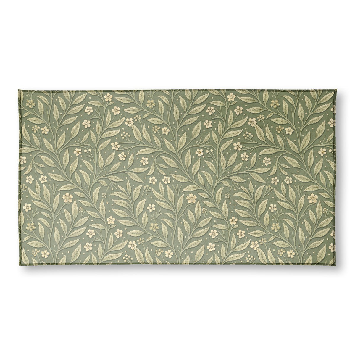 An elegant, Arts and Crafts-style botanical pattern featuring intertwining vines with veined leaves and small cream flowers. The seamless design is set against a dark sage green background, giving it a classic, embossed wallpaper appearance with a subtle three-dimensional quality.