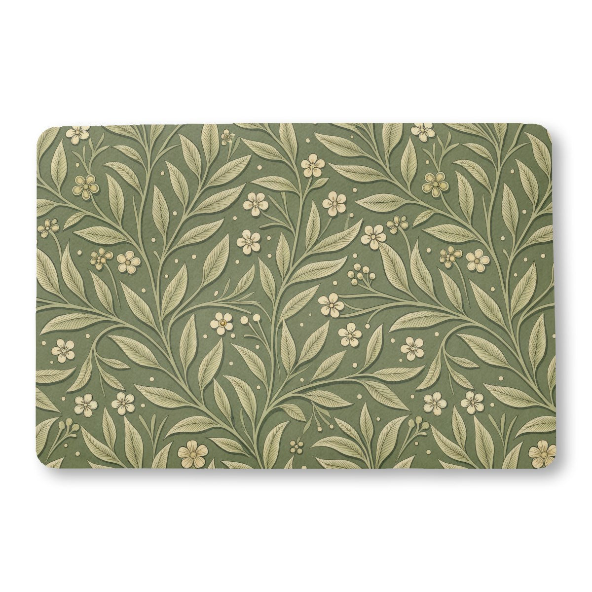 An elegant, Arts and Crafts-style botanical pattern featuring intertwining vines with veined leaves and small cream flowers. The seamless design is set against a dark sage green background, giving it a classic, embossed wallpaper appearance with a subtle three-dimensional quality.