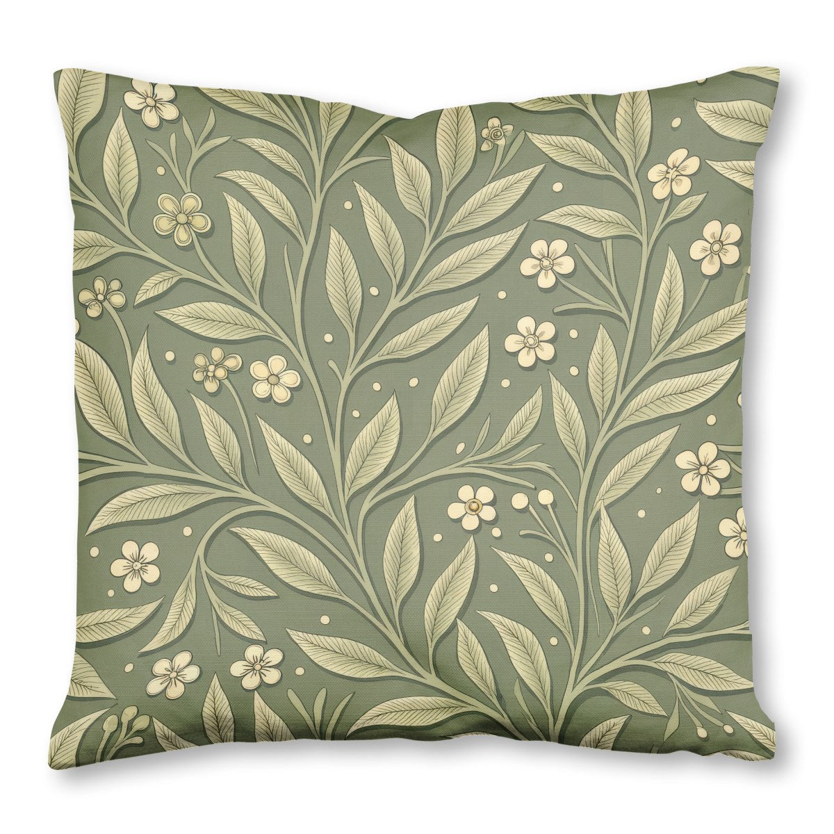 An elegant, Arts and Crafts-style botanical pattern featuring intertwining vines with veined leaves and small cream flowers. The seamless design is set against a dark sage green background, giving it a classic, embossed wallpaper appearance with a subtle three-dimensional quality.