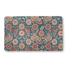 A dense, folk art-inspired pattern features stylized flowers, leaves, and ferns against a dark teal background. The illustration uses a warm, autumnal palette of rust, orange, and cream, creating a rich, vintage textile feel.