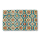 A vibrant, bohemian tile pattern features intricate sun and floral mandalas. The detailed orange, cream, and beige motifs are set within ornate diamond shapes on a rich teal background, creating a decorative, folk-art feel.