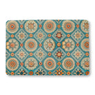 A vibrant, bohemian tile pattern features intricate sun and floral mandalas. The detailed orange, cream, and beige motifs are set within ornate diamond shapes on a rich teal background, creating a decorative, folk-art feel.