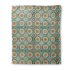 A vibrant, bohemian tile pattern features intricate sun and floral mandalas. The detailed orange, cream, and beige motifs are set within ornate diamond shapes on a rich teal background, creating a decorative, folk-art feel.