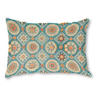 A vibrant, bohemian tile pattern features intricate sun and floral mandalas. The detailed orange, cream, and beige motifs are set within ornate diamond shapes on a rich teal background, creating a decorative, folk-art feel.
