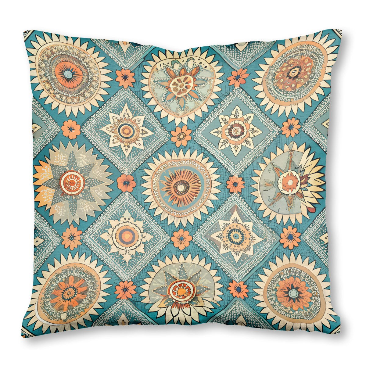 A vibrant, bohemian tile pattern features intricate sun and floral mandalas. The detailed orange, cream, and beige motifs are set within ornate diamond shapes on a rich teal background, creating a decorative, folk-art feel.