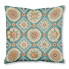 A vibrant, bohemian tile pattern features intricate sun and floral mandalas. The detailed orange, cream, and beige motifs are set within ornate diamond shapes on a rich teal background, creating a decorative, folk-art feel.