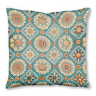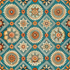 A vibrant, bohemian tile pattern features intricate sun and floral mandalas. The detailed orange, cream, and beige motifs are set within ornate diamond shapes on a rich teal background, creating a decorative, folk-art feel.