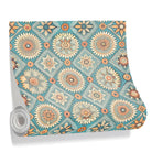 A vibrant, bohemian tile pattern features intricate sun and floral mandalas. The detailed orange, cream, and beige motifs are set within ornate diamond shapes on a rich teal background, creating a decorative, folk-art feel.