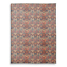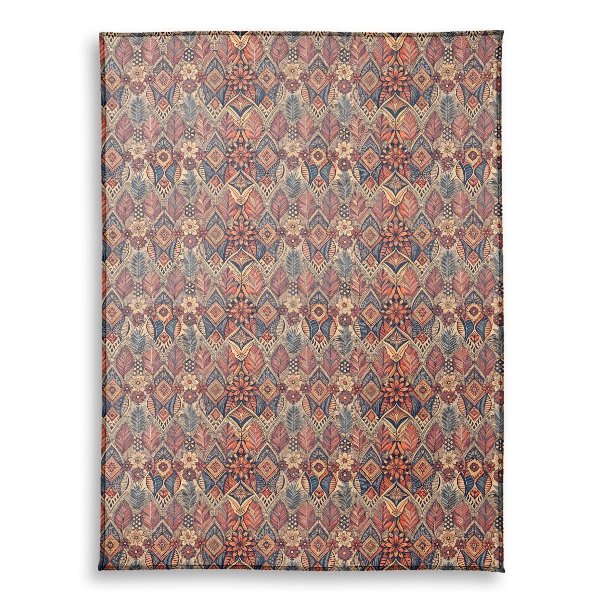 This is an intricate, hand-drawn bohemian pattern featuring a dense tapestry of feathers, flowers, and geometric motifs. The rich, earthy color palette of rust, orange, and navy blue creates a vibrant, folk-art-inspired design with a rustic feel.