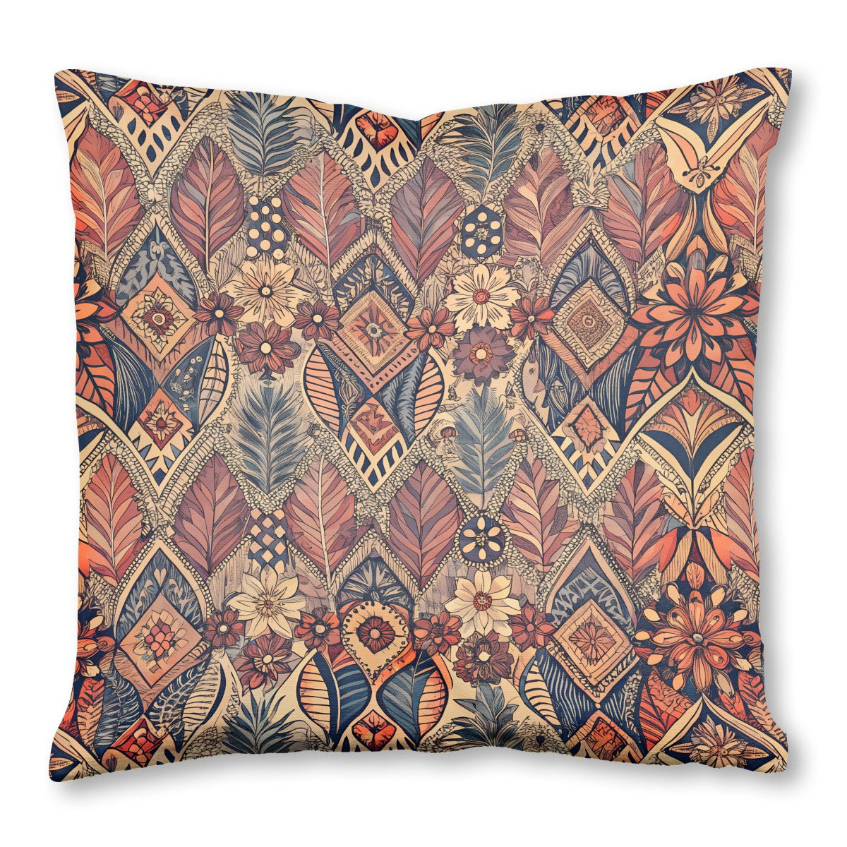 This is an intricate, hand-drawn bohemian pattern featuring a dense tapestry of feathers, flowers, and geometric motifs. The rich, earthy color palette of rust, orange, and navy blue creates a vibrant, folk-art-inspired design with a rustic feel.