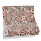 This is an intricate, hand-drawn bohemian pattern featuring a dense tapestry of feathers, flowers, and geometric motifs. The rich, earthy color palette of rust, orange, and navy blue creates a vibrant, folk-art-inspired design with a rustic feel.