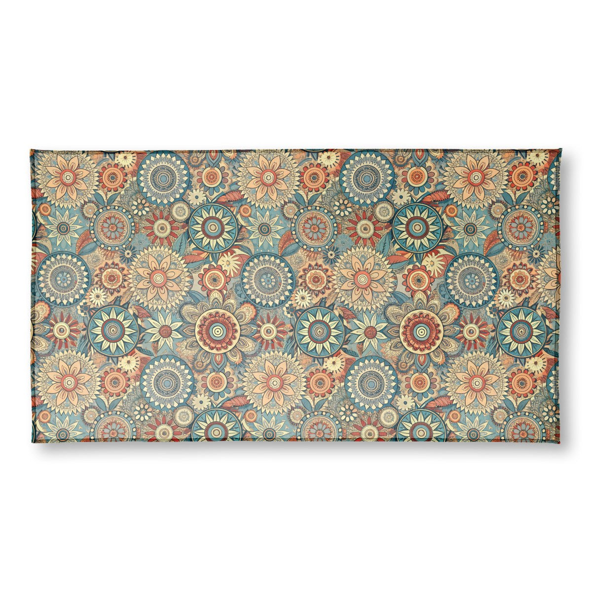 A dense, bohemian-style pattern of intricate, hand-drawn mandalas and stylized flowers. The collage-like design uses an earthy color palette of teal, orange, and cream, creating a vintage, folk-art feel.