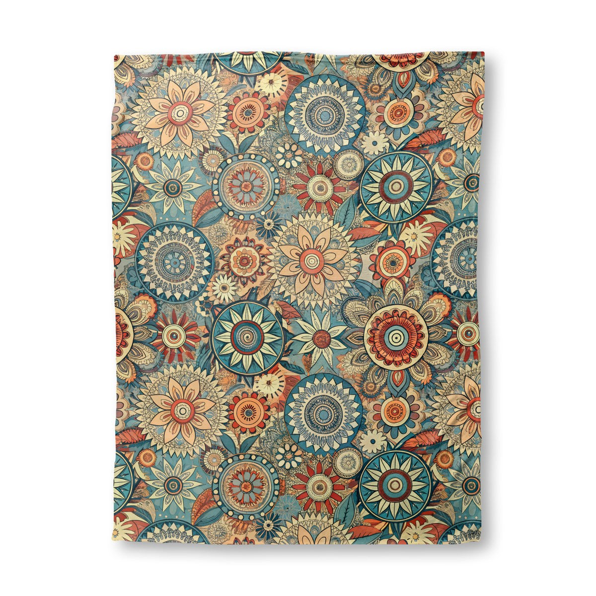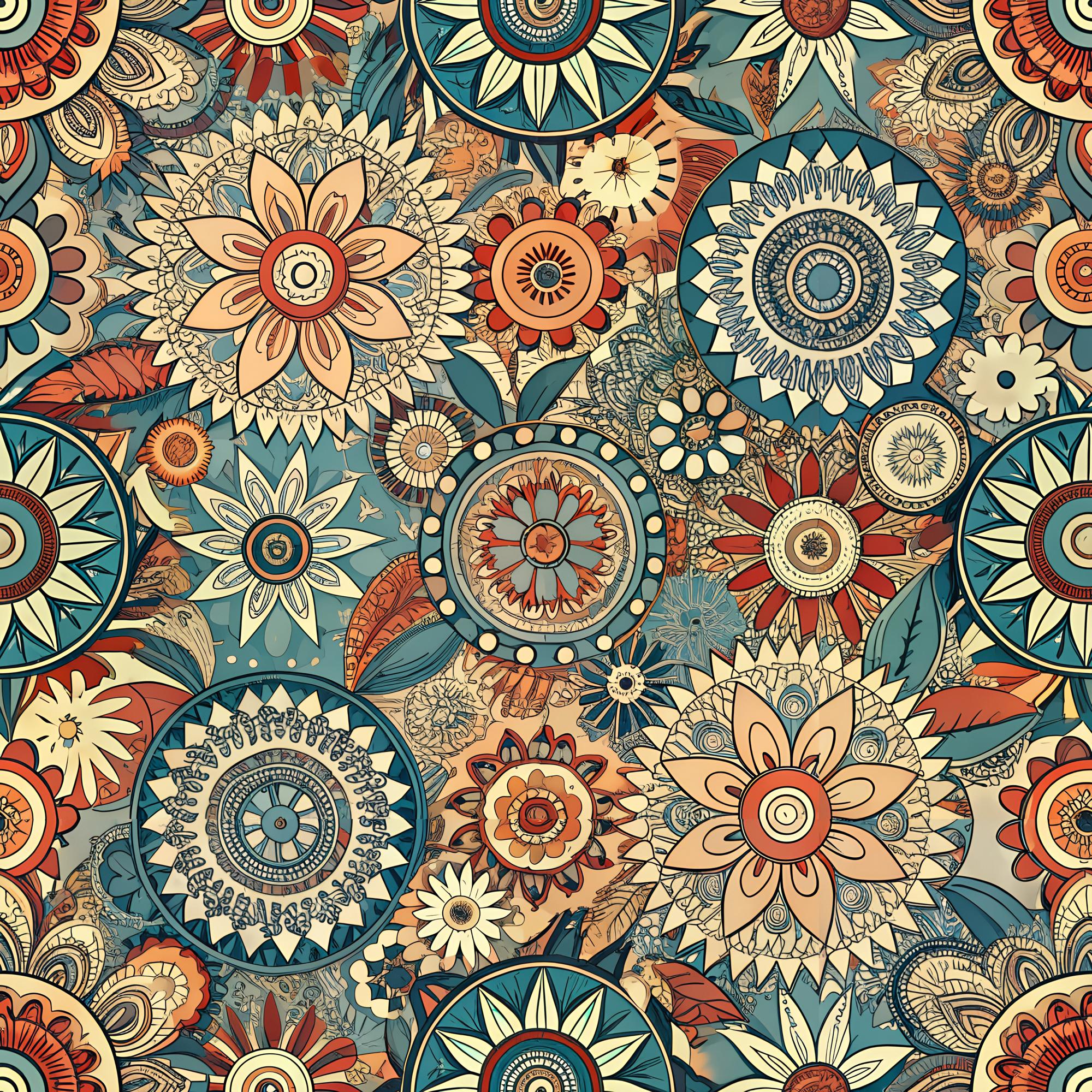 A dense, bohemian-style pattern of intricate, hand-drawn mandalas and stylized flowers. The collage-like design uses an earthy color palette of teal, orange, and cream, creating a vintage, folk-art feel.