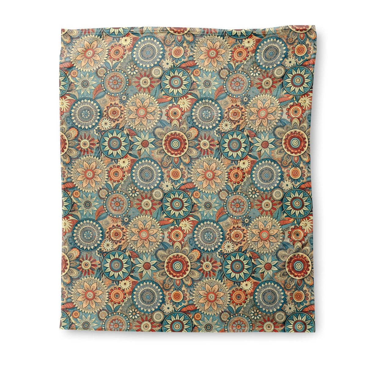 A dense, bohemian-style pattern of intricate, hand-drawn mandalas and stylized flowers. The collage-like design uses an earthy color palette of teal, orange, and cream, creating a vintage, folk-art feel.