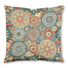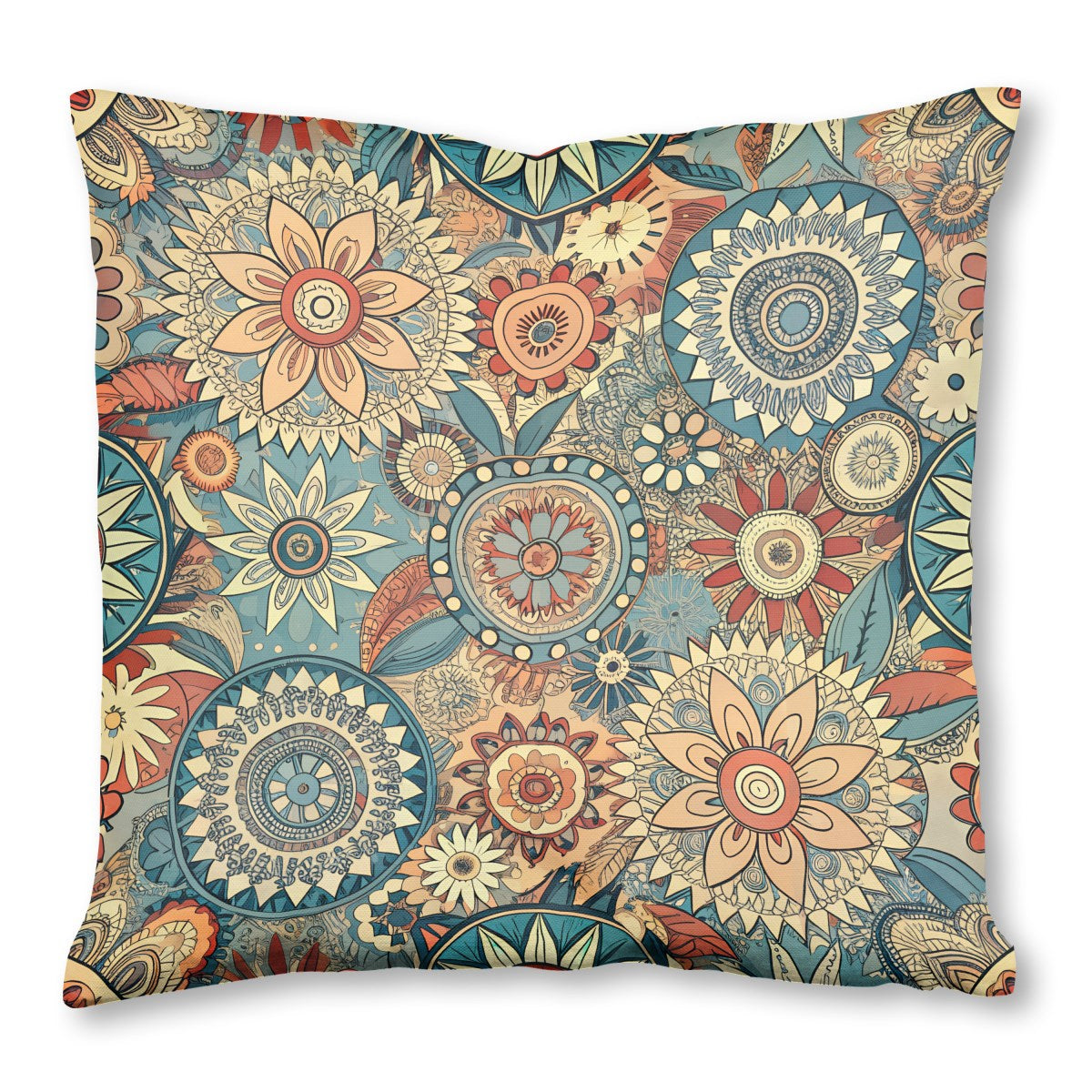 A dense, bohemian-style pattern of intricate, hand-drawn mandalas and stylized flowers. The collage-like design uses an earthy color palette of teal, orange, and cream, creating a vintage, folk-art feel.