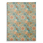 This is a vibrant, bohemian-style pattern featuring intricate, overlapping flowers and mandalas. The dense composition uses a striking color palette of teal, orange, and cream, creating a detailed and retro design with a folk-art aesthetic.