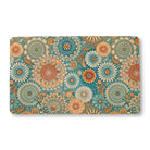 This is a vibrant, bohemian-style pattern featuring intricate, overlapping flowers and mandalas. The dense composition uses a striking color palette of teal, orange, and cream, creating a detailed and retro design with a folk-art aesthetic.