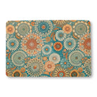 This is a vibrant, bohemian-style pattern featuring intricate, overlapping flowers and mandalas. The dense composition uses a striking color palette of teal, orange, and cream, creating a detailed and retro design with a folk-art aesthetic.