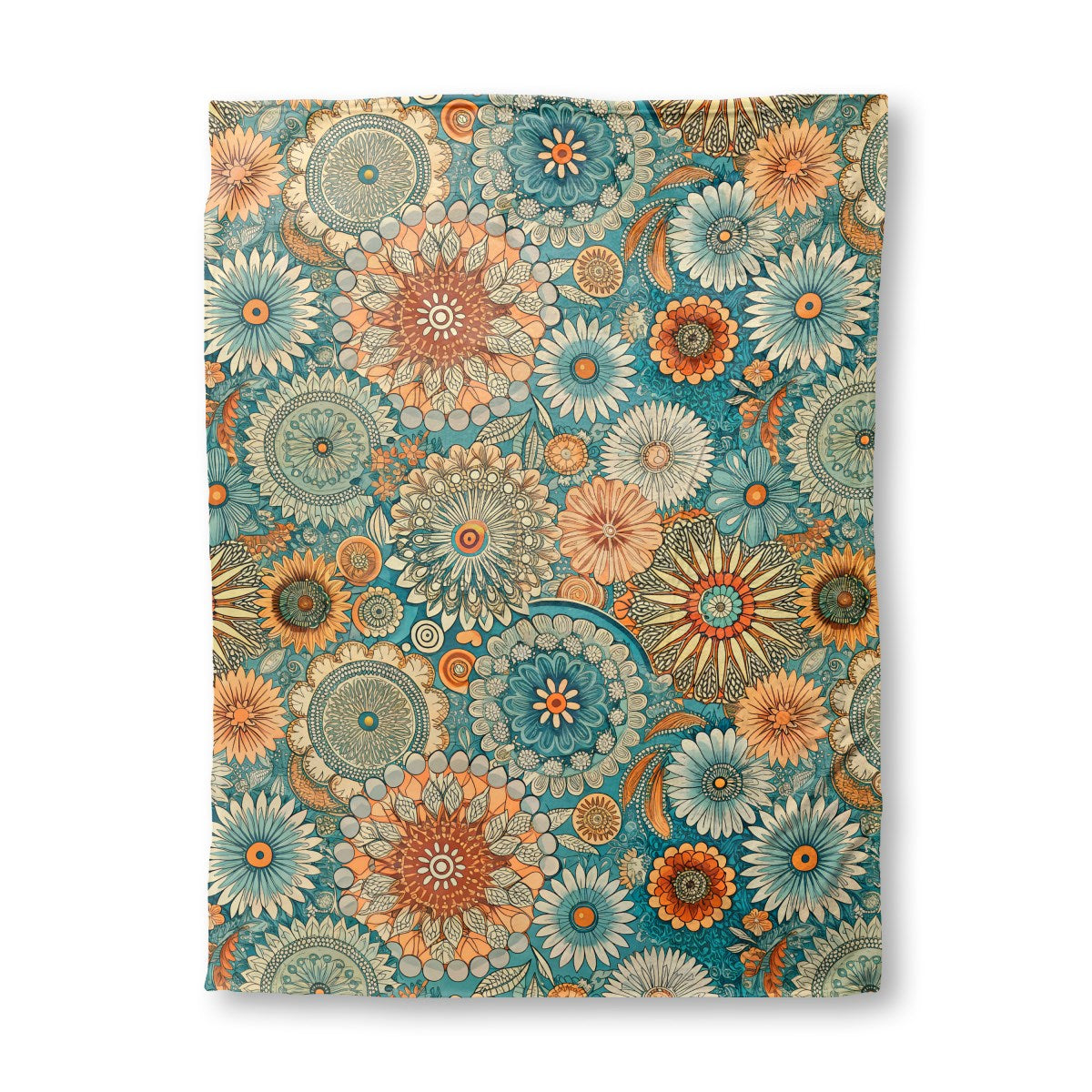 This is a vibrant, bohemian-style pattern featuring intricate, overlapping flowers and mandalas. The dense composition uses a striking color palette of teal, orange, and cream, creating a detailed and retro design with a folk-art aesthetic.