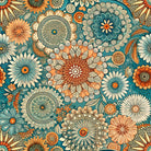 This is a vibrant, bohemian-style pattern featuring intricate, overlapping flowers and mandalas. The dense composition uses a striking color palette of teal, orange, and cream, creating a detailed and retro design with a folk-art aesthetic.