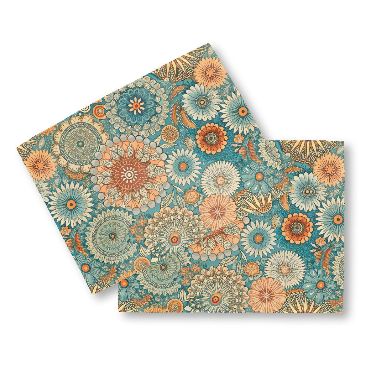 This is a vibrant, bohemian-style pattern featuring intricate, overlapping flowers and mandalas. The dense composition uses a striking color palette of teal, orange, and cream, creating a detailed and retro design with a folk-art aesthetic.