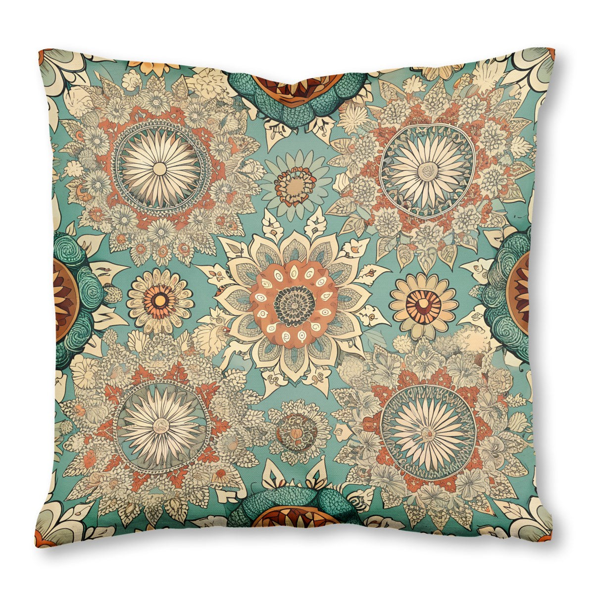 A vintage-style seamless pattern of intricate floral mandalas in a bohemian style. The design features a warm, earthy palette of orange, rust, and cream against a muted teal background, evoking the look of traditional block prints.