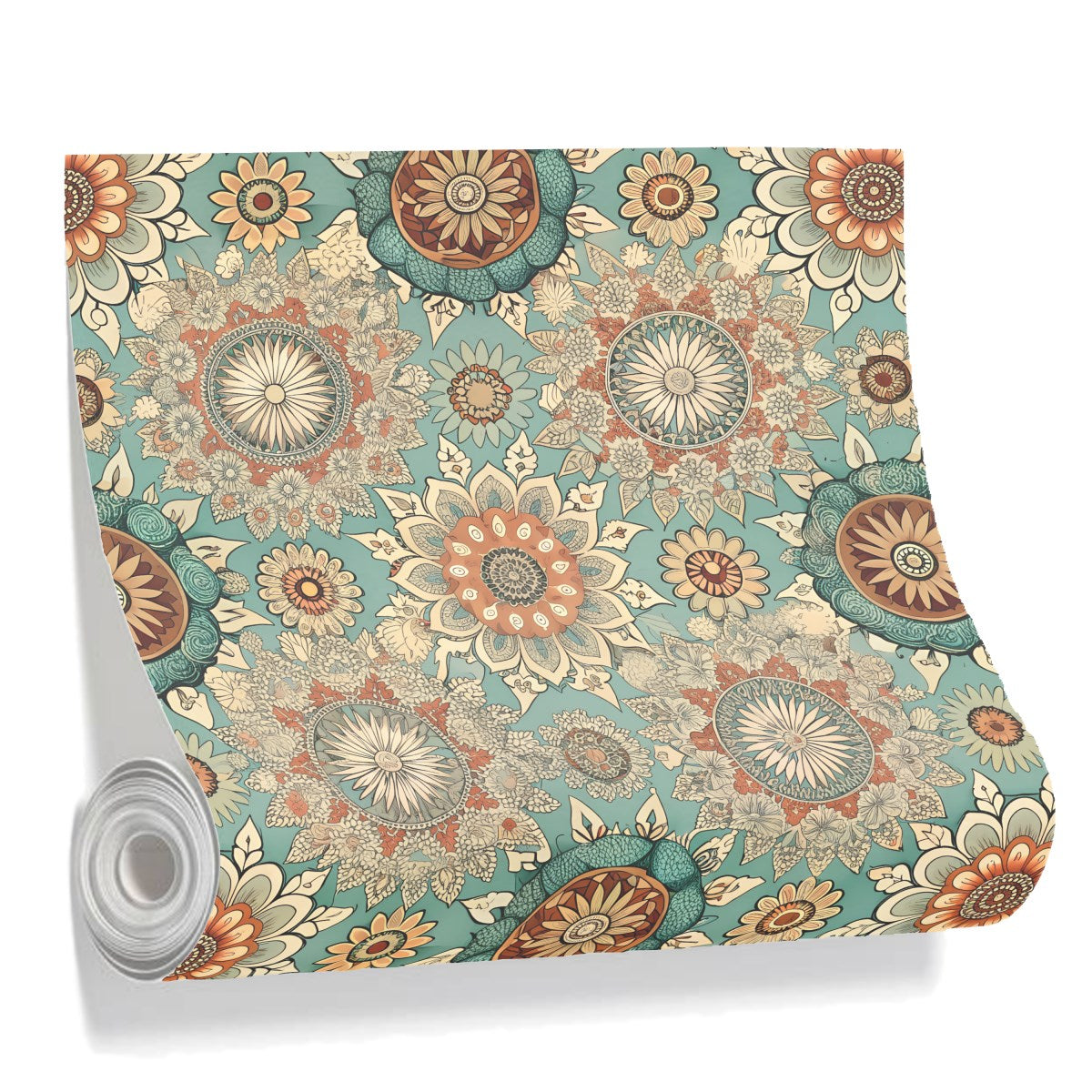 A vintage-style seamless pattern of intricate floral mandalas in a bohemian style. The design features a warm, earthy palette of orange, rust, and cream against a muted teal background, evoking the look of traditional block prints.