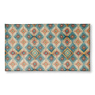 This image displays a richly textured, repeating geometric pattern with a Southwestern or tribal aesthetic. Jagged-edged diamonds in a palette of teal, red, and earthy tones create a rustic, weathered design reminiscent of a woven rug or textile.