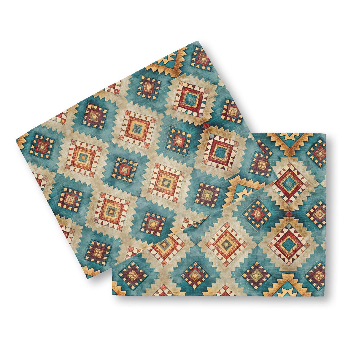 This image displays a richly textured, repeating geometric pattern with a Southwestern or tribal aesthetic. Jagged-edged diamonds in a palette of teal, red, and earthy tones create a rustic, weathered design reminiscent of a woven rug or textile.