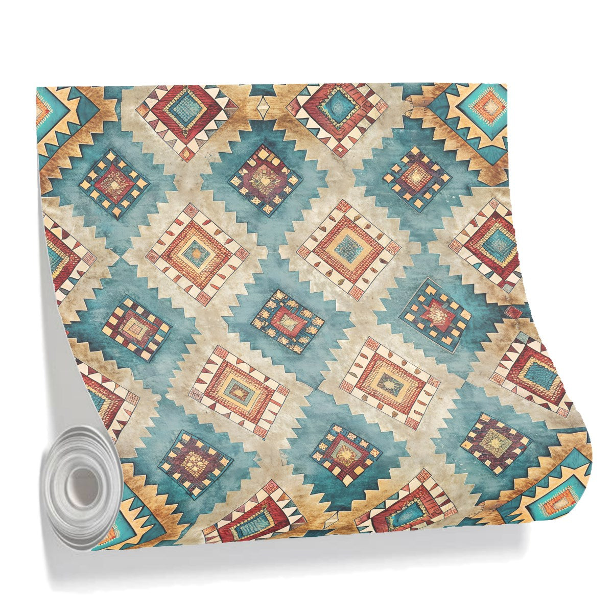This image displays a richly textured, repeating geometric pattern with a Southwestern or tribal aesthetic. Jagged-edged diamonds in a palette of teal, red, and earthy tones create a rustic, weathered design reminiscent of a woven rug or textile.