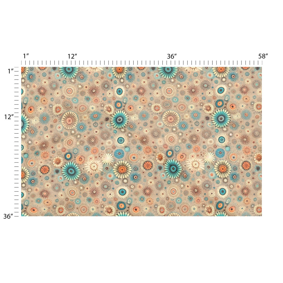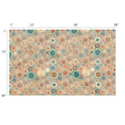 A dense, artistic collage of stylized flowers and circular motifs. The intricate designs feature a retro color palette of teal, orange, and earth tones against a textured background, creating a vibrant, bohemian-inspired pattern.