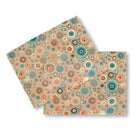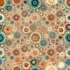 A dense, artistic collage of stylized flowers and circular motifs. The intricate designs feature a retro color palette of teal, orange, and earth tones against a textured background, creating a vibrant, bohemian-inspired pattern.