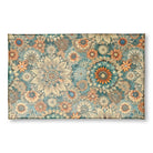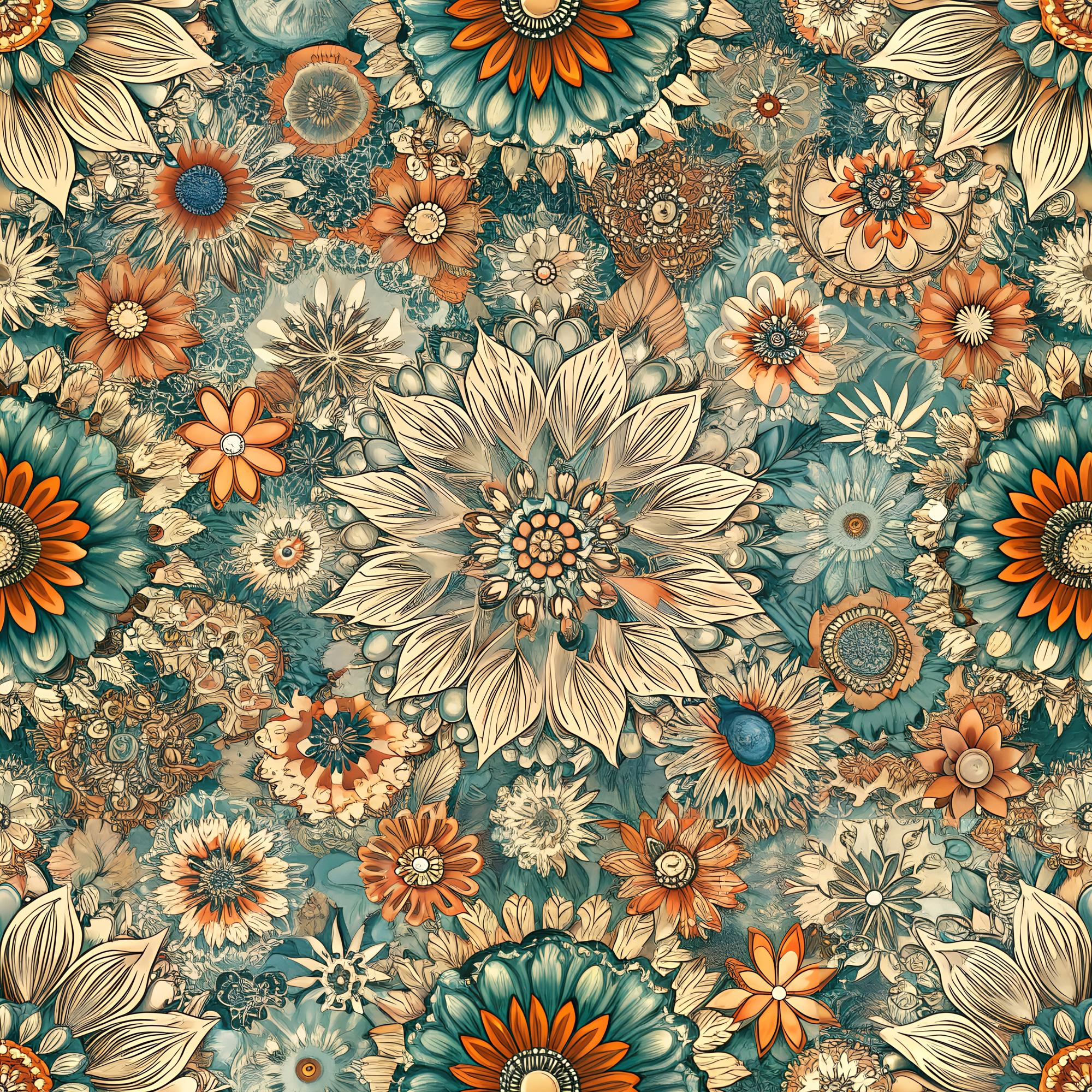 A dense, retro-style floral pattern features intricately detailed flowers. The busy, repeating design uses a striking color palette of teal, orange, and cream, creating a rich and decorative visual tapestry with a vintage, illustrative feel.
