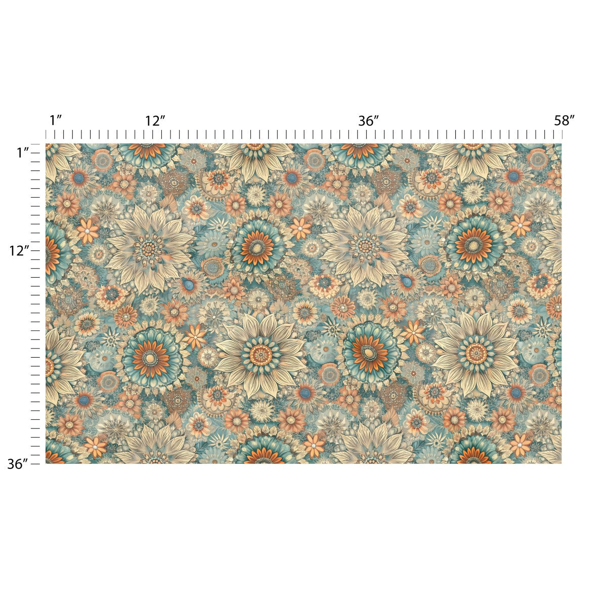 A dense, retro-style floral pattern features intricately detailed flowers. The busy, repeating design uses a striking color palette of teal, orange, and cream, creating a rich and decorative visual tapestry with a vintage, illustrative feel.
