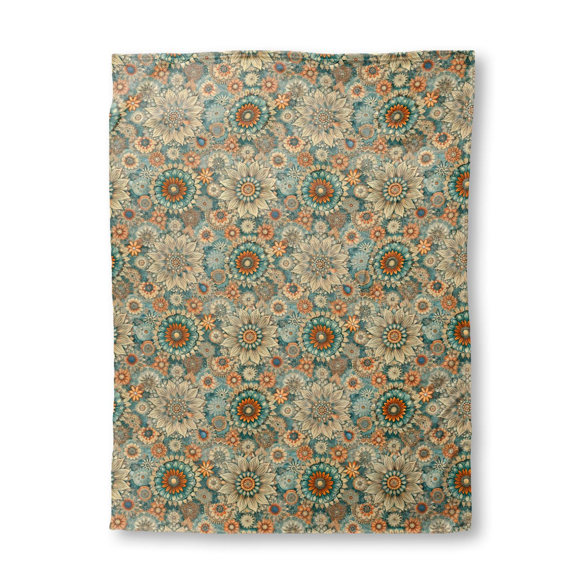 A dense, retro-style floral pattern features intricately detailed flowers. The busy, repeating design uses a striking color palette of teal, orange, and cream, creating a rich and decorative visual tapestry with a vintage, illustrative feel.
