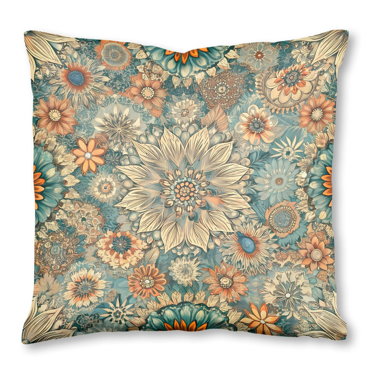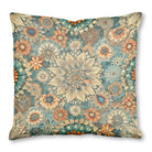 A dense, retro-style floral pattern features intricately detailed flowers. The busy, repeating design uses a striking color palette of teal, orange, and cream, creating a rich and decorative visual tapestry with a vintage, illustrative feel.
