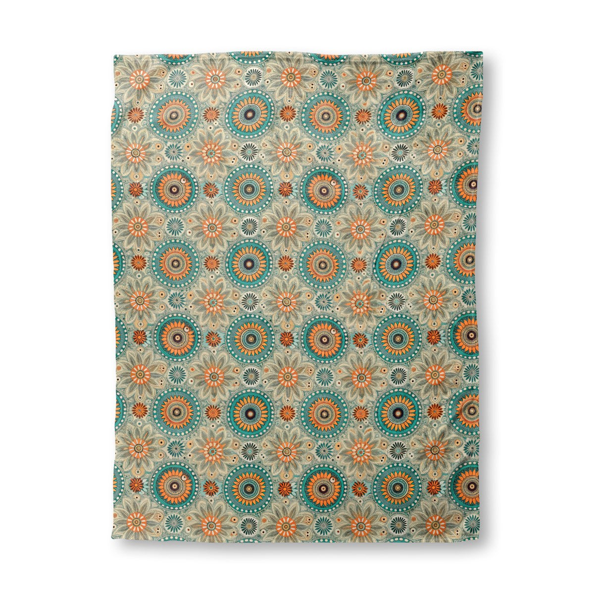 This is a vibrant, repeating pattern featuring intricate mandalas and stylized flowers in a bohemian, folk-art style. The design uses a striking color palette of teal, orange, and cream, with detailed line work and dotted textures creating a rich, layered effect.