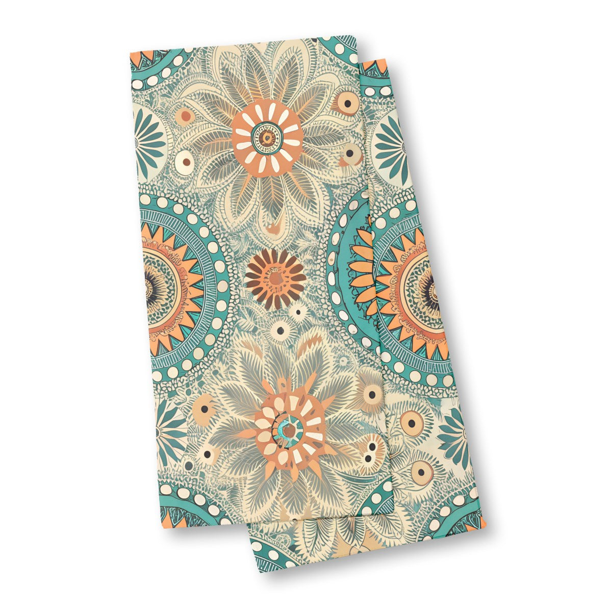 This is a vibrant, repeating pattern featuring intricate mandalas and stylized flowers in a bohemian, folk-art style. The design uses a striking color palette of teal, orange, and cream, with detailed line work and dotted textures creating a rich, layered effect.