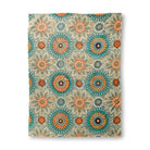 This is a vibrant, repeating pattern featuring intricate mandalas and stylized flowers in a bohemian, folk-art style. The design uses a striking color palette of teal, orange, and cream, with detailed line work and dotted textures creating a rich, layered effect.